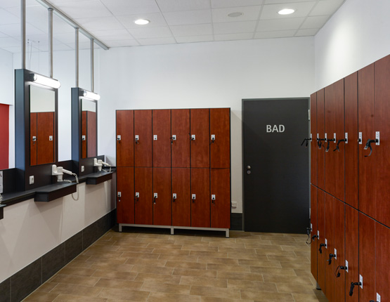 | LEISTUNG | Fensterbänke, Sanitärtrennwände, Wechselkabinen, Sammelumkleidkabinen, Garderobenschränke, Frisierplätze, Regale, Sitzbänke, Tresen, Ausstattung Schwimmmeisterraum, Wickelraum |