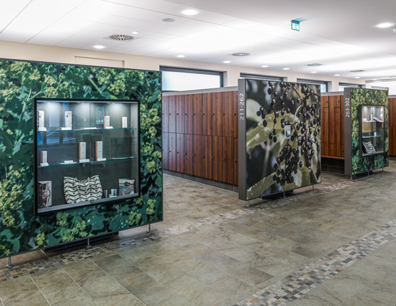 | LEISTUNG | Sanitärtrennwände, Umkleidekabinen, Garderobenschränke, Frisierplätze, Einbauregale, Wertfächer |